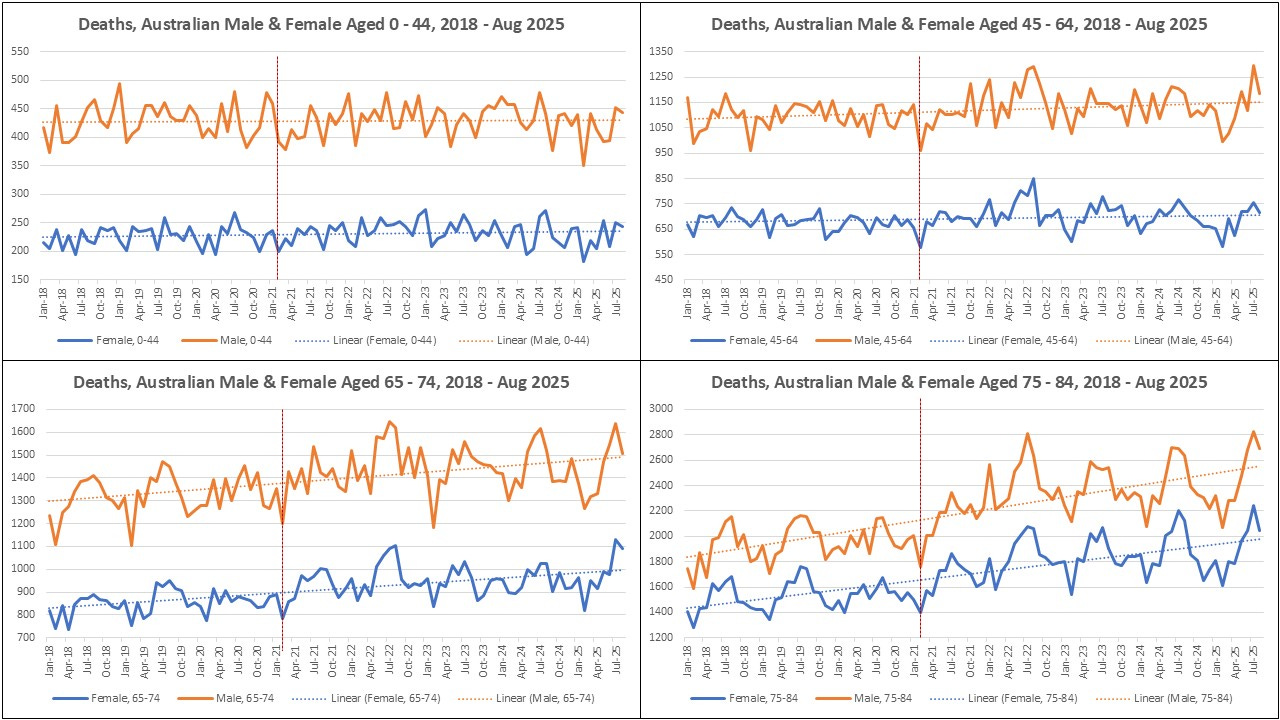 Australian Mortality Data to August 2025 was released on 28 November 2025. Total Mortality to August down 1.1% vs 2024. Males Deaths 45-64, and all Folks Older than 65 had Highest Annual Peak in 2025.