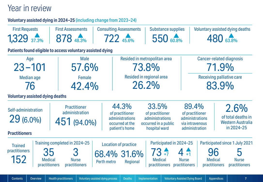 Western Australia’s Annual 2024 Report on VAD shows rapid increase in provision of this service and notes that “56% of reflections (n=20) received by the Board outlined issues regarding access to VAD”, with the Board making recommendations “to improve the safety1 and quality of VAD”. It appears that this method of dying, is set to rise in uptake in coming years!