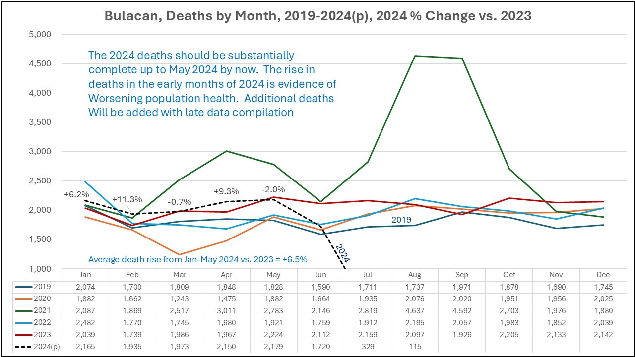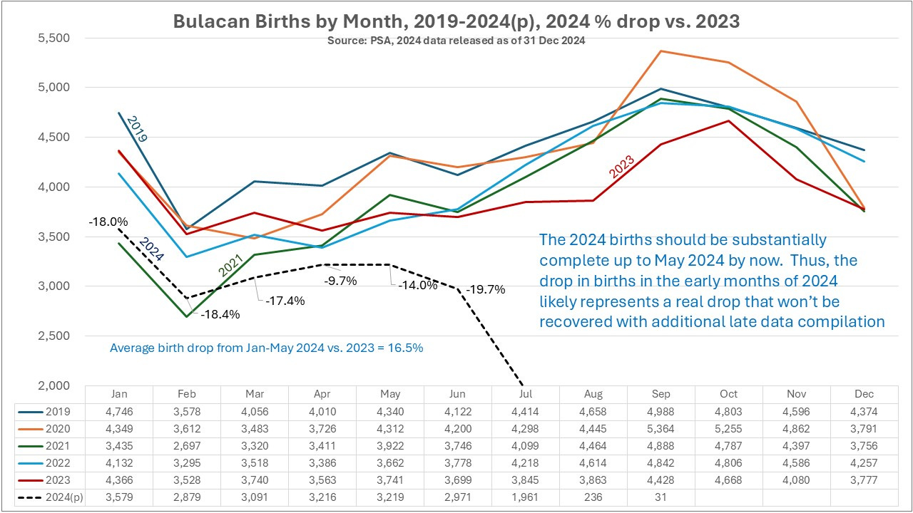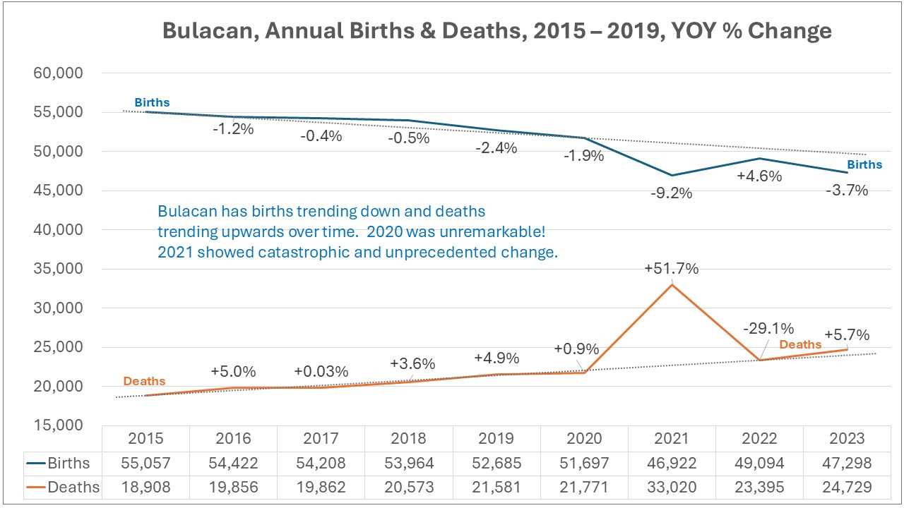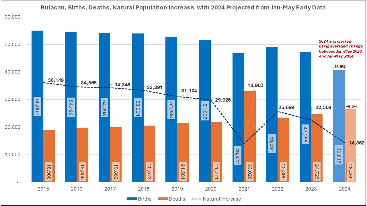 Overall, since 2019, if realized in final 2024 data, there could be in the range of a 22.6% increase in deaths and a 22.5% decrease in births in Bulacan; a 53.8% drop in annual population increase in just 5 years.