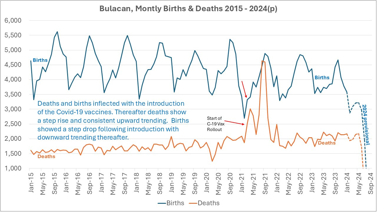 Bulacan Province, Central Luzon, Philippines Vital Statistics Showed Nothing of Note in 2020, a Mass Spike in Deaths in 2021 (+51%), and Upward Trending Deaths and Rapidly Falling Births Thereafter.